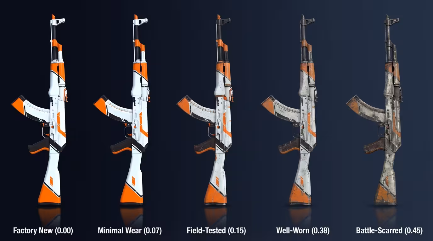 O float é um número entre 0.00 e 1.00 que define a condição visual da sua skin. Quanto menor, melhor a aparência. Ele é definido na criação e nunca muda — não importa quantas partidas você jogue.