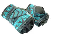 As Hand Wraps Overprint são uma daquelas skins cuja força está menos no brilho imediato e mais na inteligência do acabamento. À primeira vista, parecem simples: base escura, padrões azul-esverdeados, repetição geométrica, textura seca. Mas basta olhar um pouco mais para perceber que a graça está justamente na sensação de camada sobre camada, como se o desenho tivesse sido pressionado sobre uma luva que já carregava função demais para precisar de ornamento gratuito.