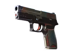 A P250 Cyber Shell entrou no jogo em 3 de maio de 2021 com o Snakebite Case, criada por Desty. A descrição oficial é direta: slide prateado e empunhadura com textura hexagonal. O flavor text empurra a leitura para outro território: "You represent the front line of our cyber security effort." Você representa a linha de frente do nosso esforço de cibersegurança. A skin pega uma pistola barata, rápida e historicamente funcional contra adversários armados e a desloca para o vocabulário de defesa digital.