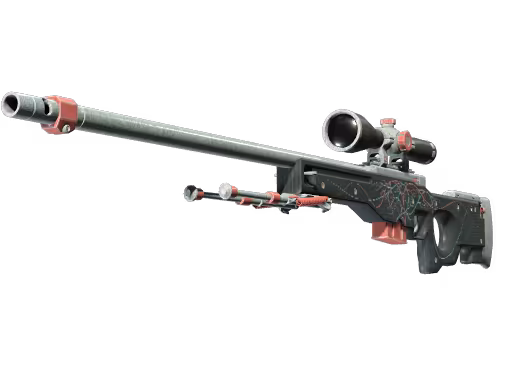 O corpo da arma apresenta uma base cinza escura, sobre a qual se desenha um padrão geométrico de linhas finas e paralelas, quase transparentes. Mas o que realmente define a skin são as veias: entrelaços de coral e teal que serpenteiam pela superfície como se a AWP estivesse viva. O carregador, pintado em coral sólido, parece um órgão bombeando sangue para o resto do sistema.