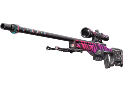 A AWP Chromatic Aberration traz listras que lembram padrões de zebra em rosa e roxo, aplicadas sobre uma base de preto e cinza. Mas o que define a skin é o tratamento dado a cada elemento: todos apresentam aquele deslocamento característico de cores, como se você estivesse vendo a arma através de uma lente defeituosa.
