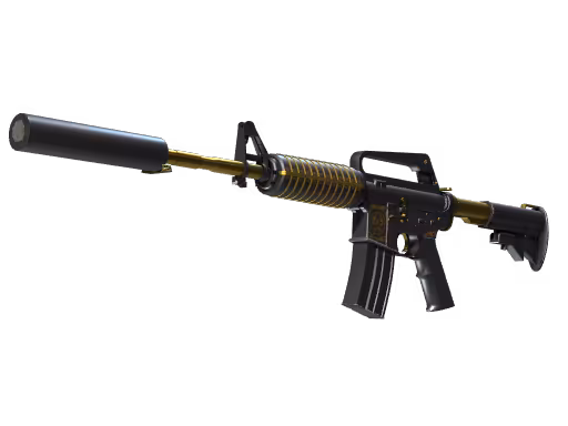 A M4A1-S Knight não tenta impressionar com cores vibrantes ou padrões complexos. Seu corpo é revestido com pintura preta brilhante, adornado com ornamentos dourados em diferentes partes da arma. O handguard, o cano e parte da coronha receberam acabamento em latão. Acima do carregador, um emblema de contra-terrorista complementa o design. A descrição oficial confirma a inspiração: incrustações de latão com tema de armadura renascentista.