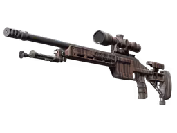 A SSG 08 Prey carrega o Finish Catalog #935, acabamento Spray-Paint desenhado pela Valve. A descrição in-game é direta: "It has been spray-painted with a rust colored zebra stripe pattern." Listras de zebra em tons de ferrugem — o padrão projetado sobre o corpo do rifle de modo que cada cópia recebe uma disposição ligeiramente diferente das listras. A skin é Consumer Grade na The 2021 Mirage Collection e fecha com um ciclo em quatro tempos: "Eat, sleep, hunt, repeat."