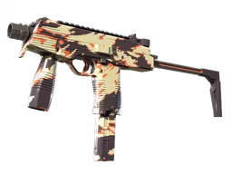A MP9 Shredded é uma skin Mil-Spec da Radiant Collection. Não há StatTrak. O acabamento hidrográfico varia com o pattern index, e o desgaste progressivo dissolve as listras em direção ao substrato. É uma submetralhadora compacta vestida no padrão de um predador de emboscada — a MP9 Food Chain, de outra coleção, ilustrou a pirâmide alimentar sobre esta mesma arma. A Shredded não ilustra a cadeia. Veste o animal que senta no topo dela. E o flavor text lembra que mesmo o topo pode ser frágil.